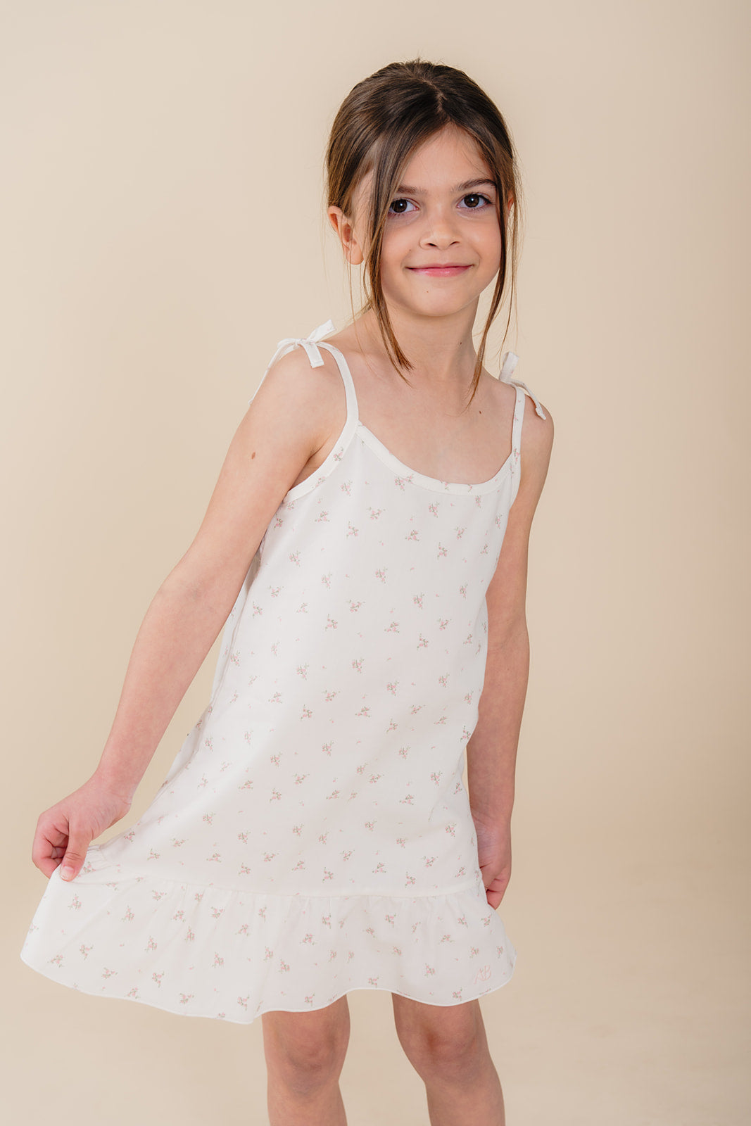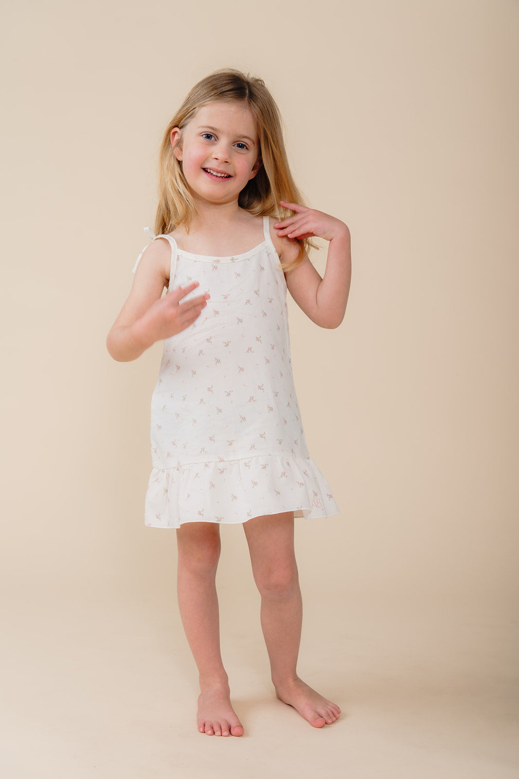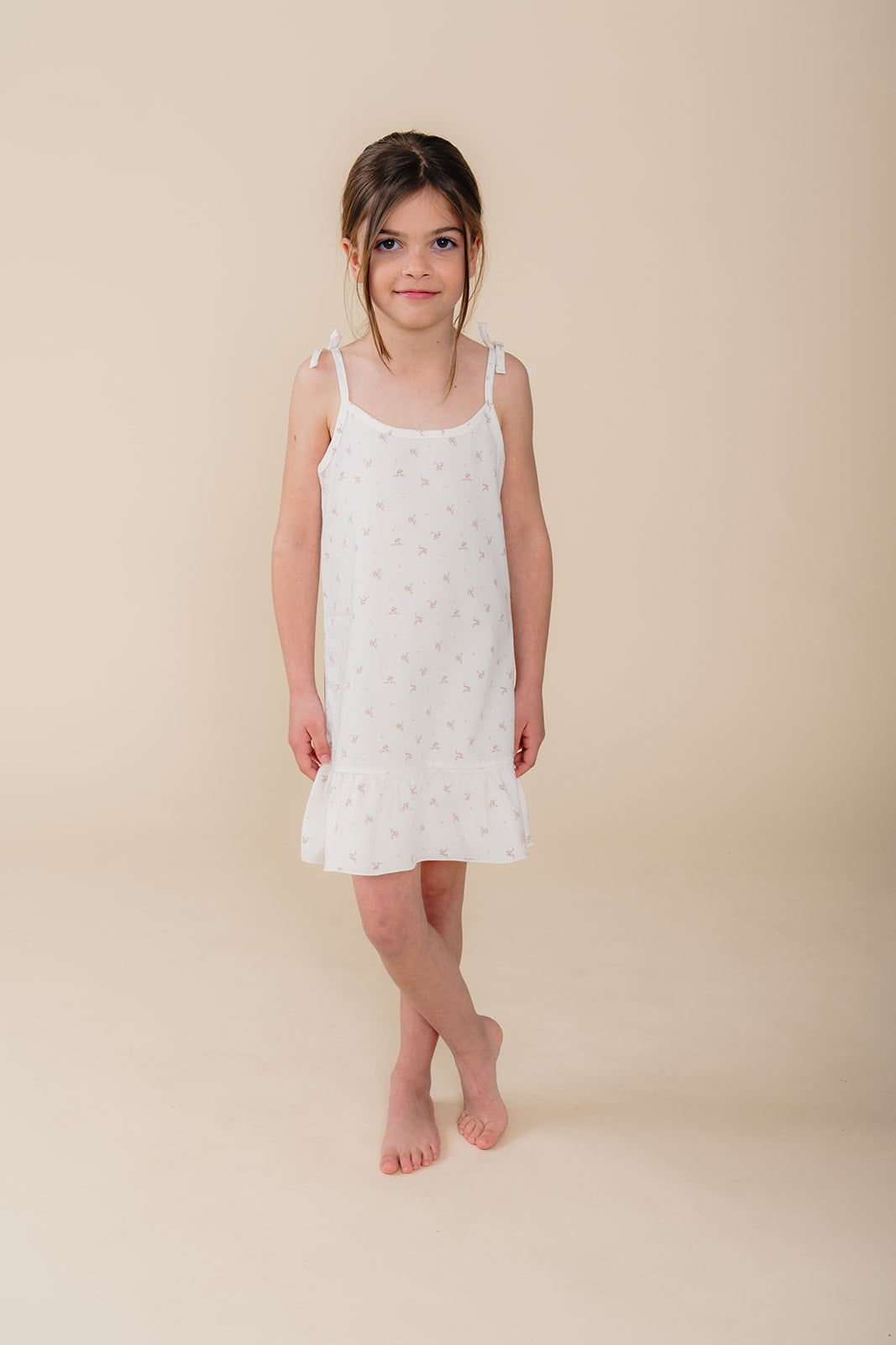 Meisje in witte katoenen pyjama-jurk met bloemenprint uit de Cozy Dawn collectie van Atelier Bonheur, duurzame nachtkleding voor kinderen.