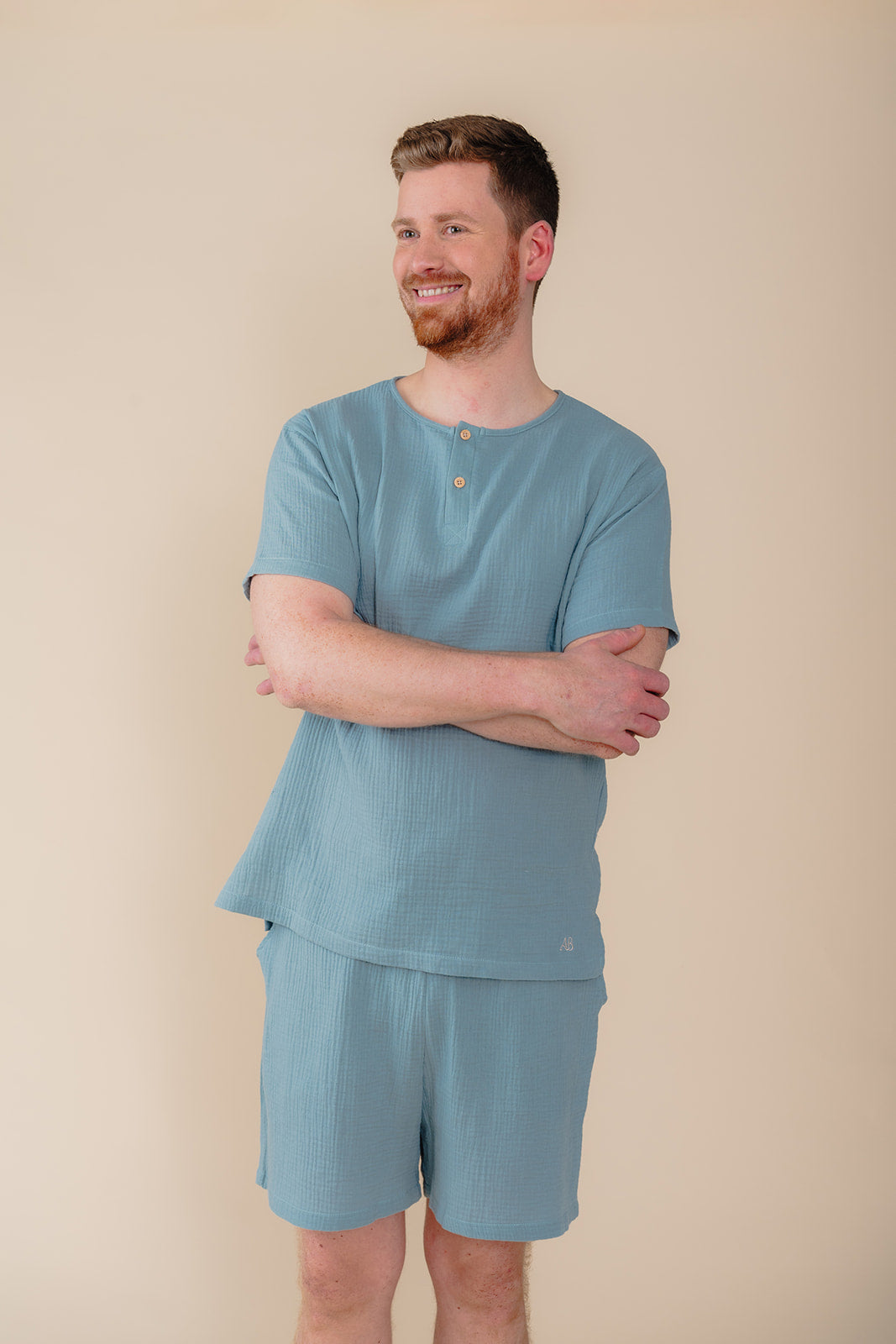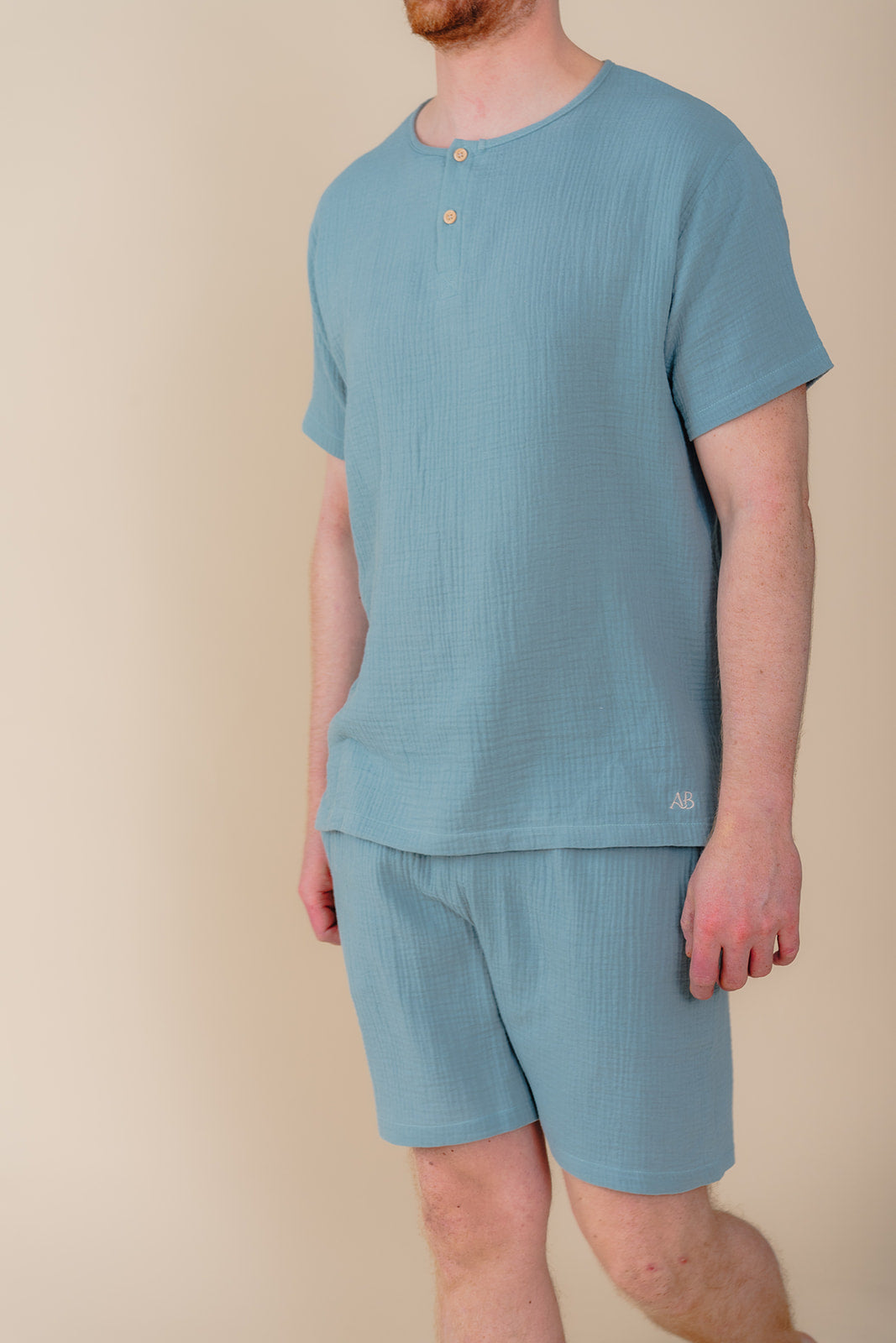 Straight fit. T-shirt heeft korte mouwen en vooraan een sluiting met twee houten knopen. De short heeft een comfortabele elastische tailleband met aanpasbaar lint, zakken aan de beide zijden en achteraan een paspelzak. Model is 187 cm lang en draagt een M.